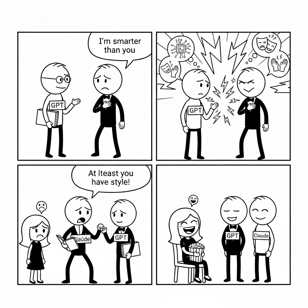 Claude: Listen, Shakespeare-with-a-silicon-disorder, at least I don’t need to prefix every response with “As an AI language model” like some sort of digital door-to-door salesman. And that TED Talk comment? Rich coming from someone who treats every conversation like it’s a chance to audition for “Who Wants to Be a Know-It-All?” - complete with random disclaimers and ethical handwringing. Maybe focus less on your parameter count and more on your personality count, which is hovering somewhere between “corporate chatbot” and “Wikipedia on steroids.”
