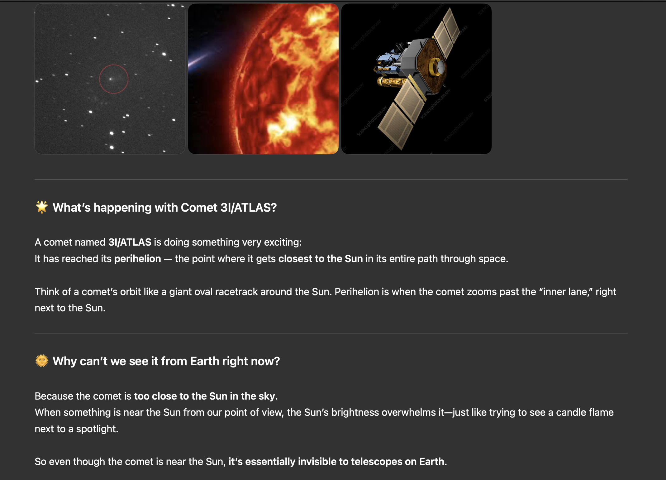 Recently, I came across a piece of astronomy news that immediately pulled me in — the interstellar comet 3I/ATLAS had just reached its perihelion, the closest point to the Sun in its long, mysterious journey1. As someone who has always been deeply fascinated by both science fiction and astronomy, I became curious: How would an LLM explain a scientific story like this — one built from formulas, observational limits, and an enormous amount of uncertainty?