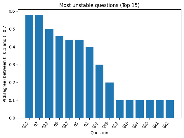 So a taller bar means that question flips more often across the two temperature settings. It is not saying the model less “correct” in these questions, only that the choice is less stable when sampling becomes more random.