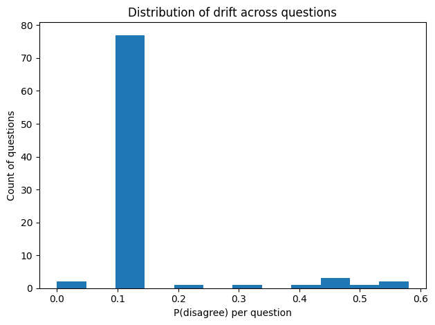 And in the next figure, we shows the overall shape of drift across all 88 questions. The histogram just counts how many questions fall into each drift range.